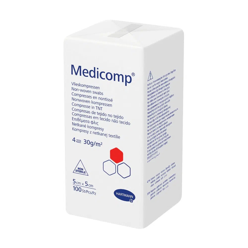 Die Hartmann Medicomp® unsterile Vlieskompressen bestehen aus einer Mischung von Viskose- und Polyesterfasern. Der Viskoseanteil beträgt zwischen 67% und 70%, der verbleibende Anteil besteht aus Polyesterfasern. Die Kompressen sind frei von Bindemitteln und optischen Aufhellern, luftdurchlässig und vierfach gelegt sowie in verschiedenen Größen erhältlich. Die Kompressen können auseinandergefaltet werden, wenn ein größeres Format benötigt wird. Die Vlieskompressen können als primäre Wundauflage bei Verletzungen, zur Erstreinigung von Wunden und zur Reinigung von unversehrter und verletzter Haut, als Trägermaterial für externe Präparate (z.B. Desinfektionsmittel, Salben), als sekundäre Wundauflage bei akuten und chronischen Wunden, zur Aufnahme von Körperflüssigkeiten und als mechanische Barriere eingesetzt werden.
