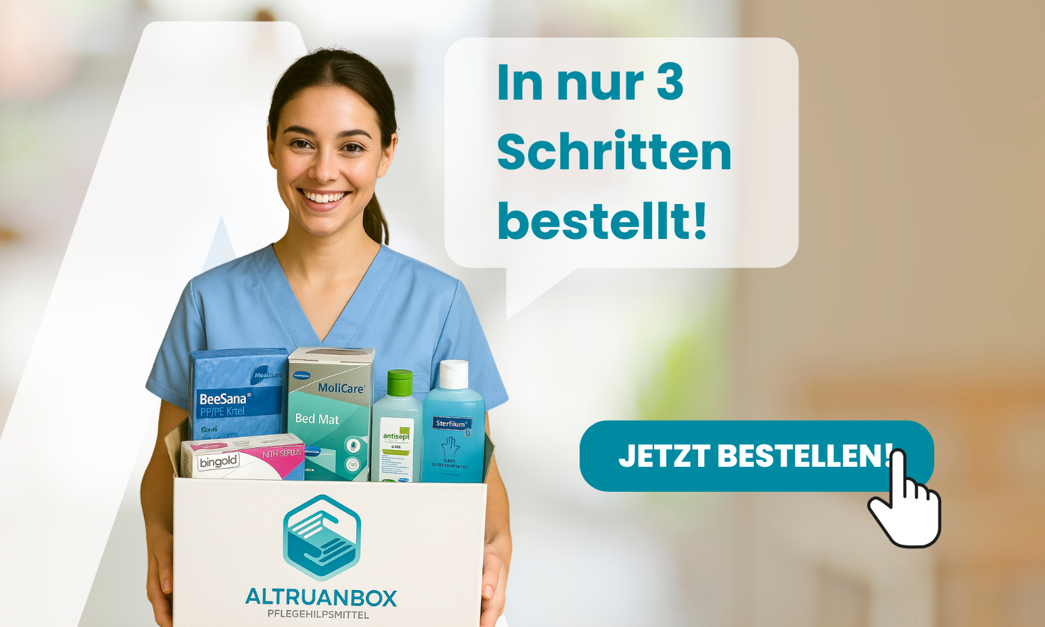 Secure your legal entitlement to care aids according to §40 SGB XI worth 42€. The AltruanBox includes a comprehensive service on the topic of home care, nursing, and care aids. The focus is on the person. We place great importance on relieving not only the person in need of care but also their relatives and providing the greatest possible support.